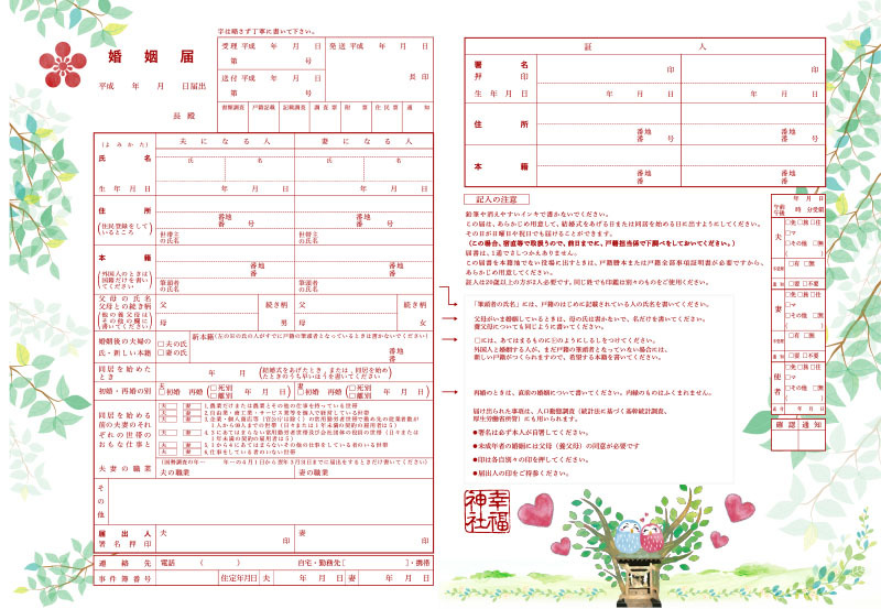 「幸福婚姻届」は国で定められた「戸籍法」に則り作成しておりますが、日向市以外の役所によっては対応が異なることも考えられますので、入籍の前に提出を予定している役所の窓口であらかじめ確認を行ってください。