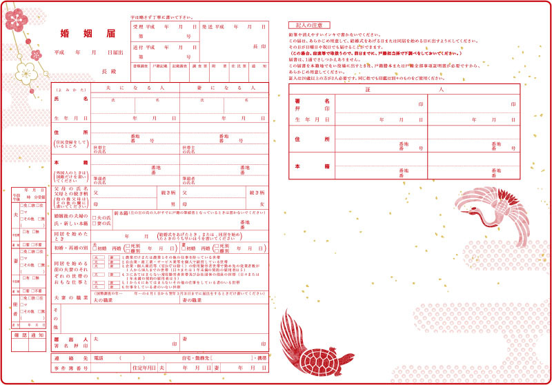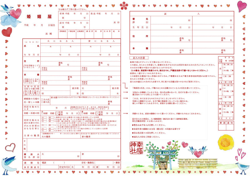 「幸福婚姻届」は国で定められた「戸籍法」に則り作成しておりますが、日向市以外の役所によっては対応が異なることも考えられますので、入籍の前に提出を予定している役所の窓口であらかじめ確認を行ってください。